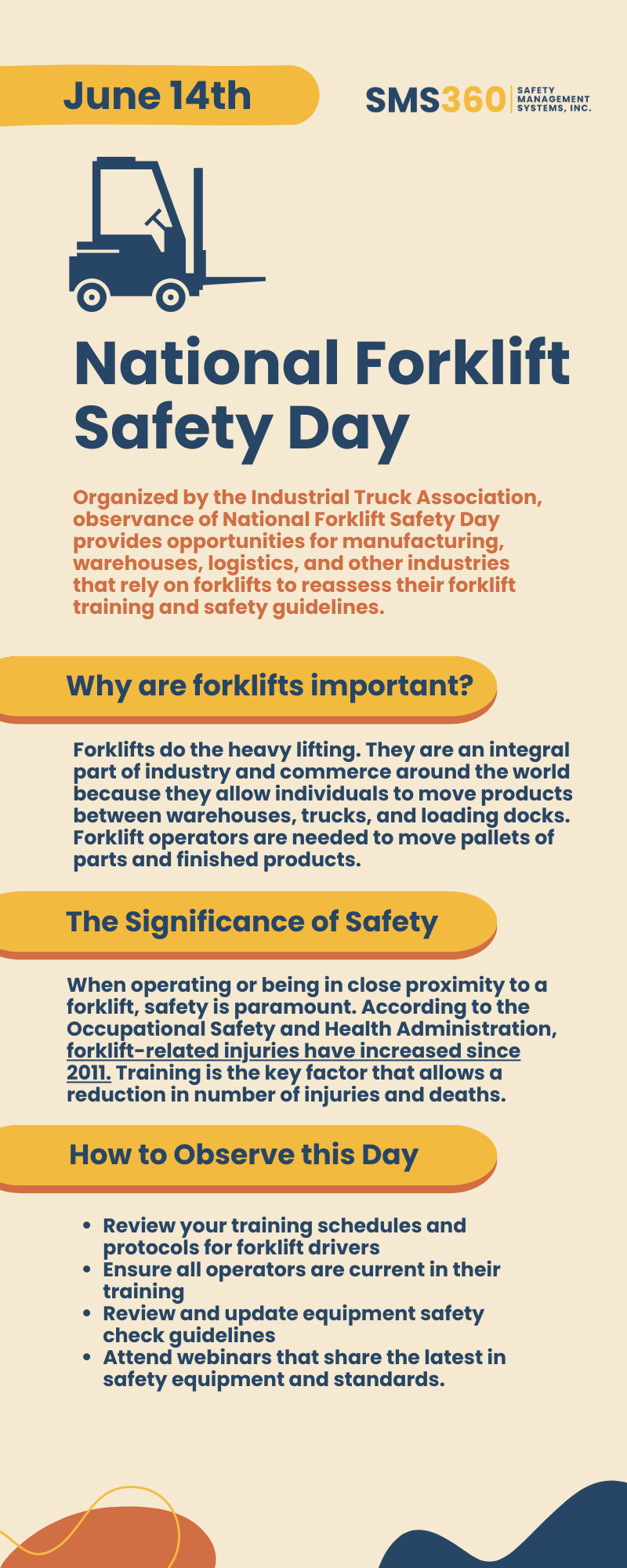 Participate in National Forklift Safety Day to ensure that forklift drivers are properly trained and follow protocol. Forklifts can be very dangerous, so it is essential that measures are taken to use this machinery safely. Be sure to take into account the type of forklift, the material being moved, and the facility where the work occurs. These factors can impact the types of training an operator needs.